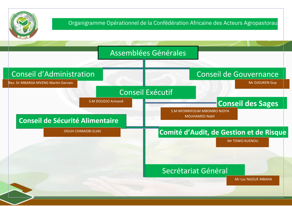 Le Conseil Exécutif (CE) assure la planification et la coordination des activités, la gestion financière, comptable, administrative et logistique, ainsi que le suivi évaluation des activités de la Confédération Africaine des Acteurs Agropastoraux (C-3A). La Confédération Africaine des Acteurs Agropastoraux (C-3A). Dont le siège est basé au Cameroun-Yaoundé